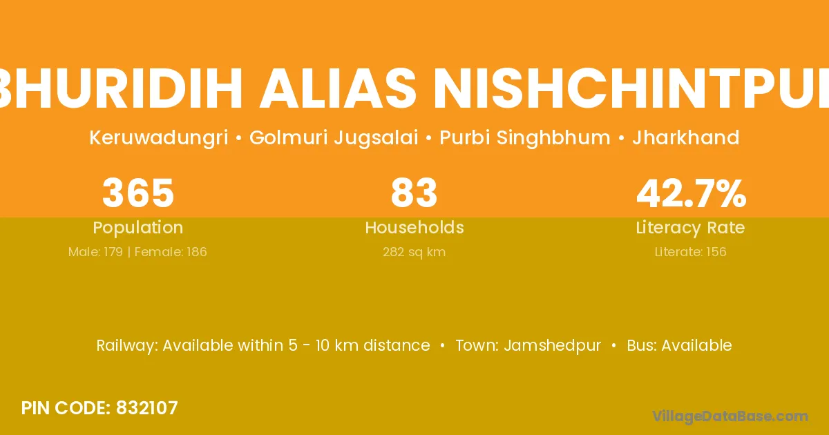 Bhuridih Alias Nishchintpur village has a total population of 365 people, of which 179 are males and 186 are females.