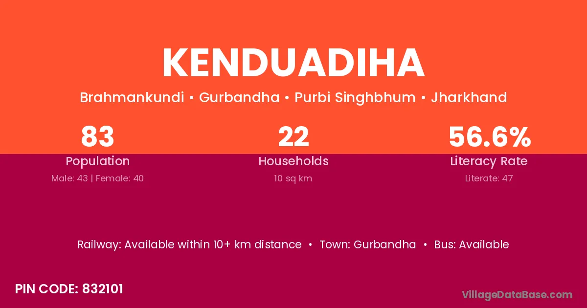 Kenduadiha village has a total population of 83 people, of which 43 are males and 40 are females.