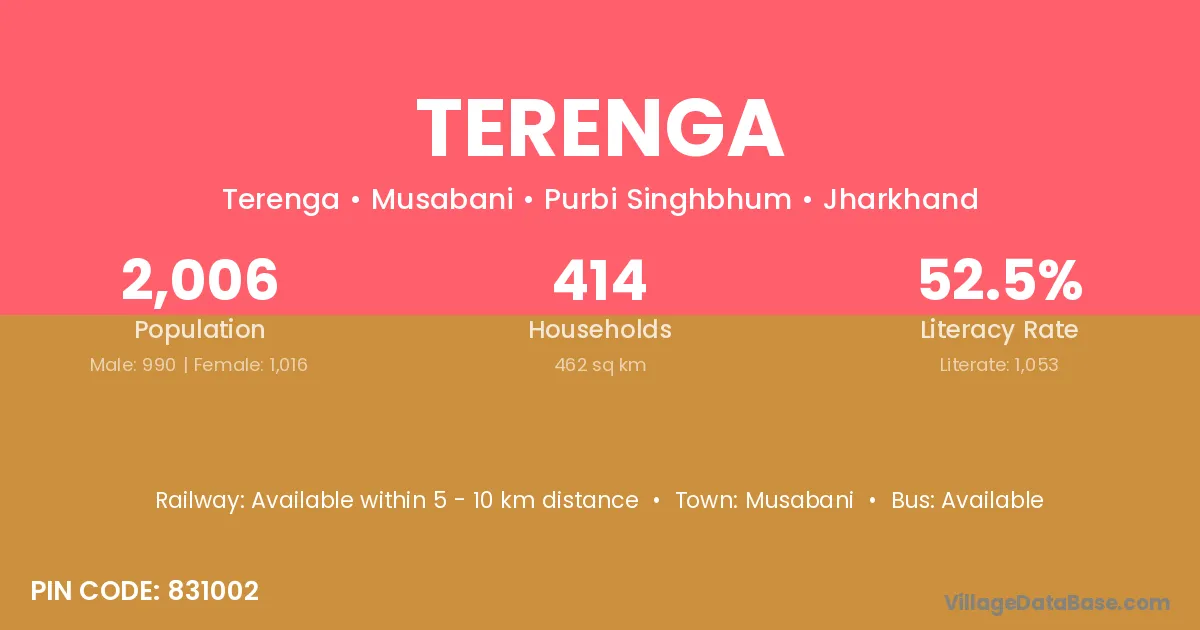 Terenga village has a total population of 2,006 people, of which 990 are males and 1,016 are females.