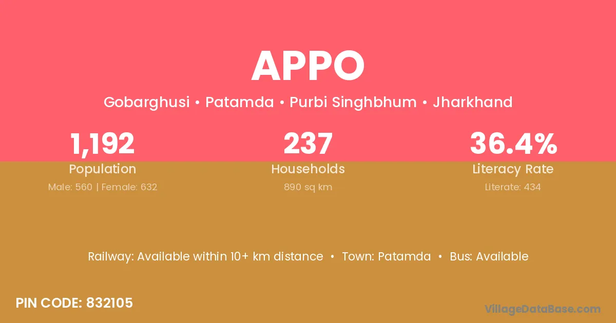 Appo village has a total population of 1,192 people, of which 560 are males and 632 are females.
