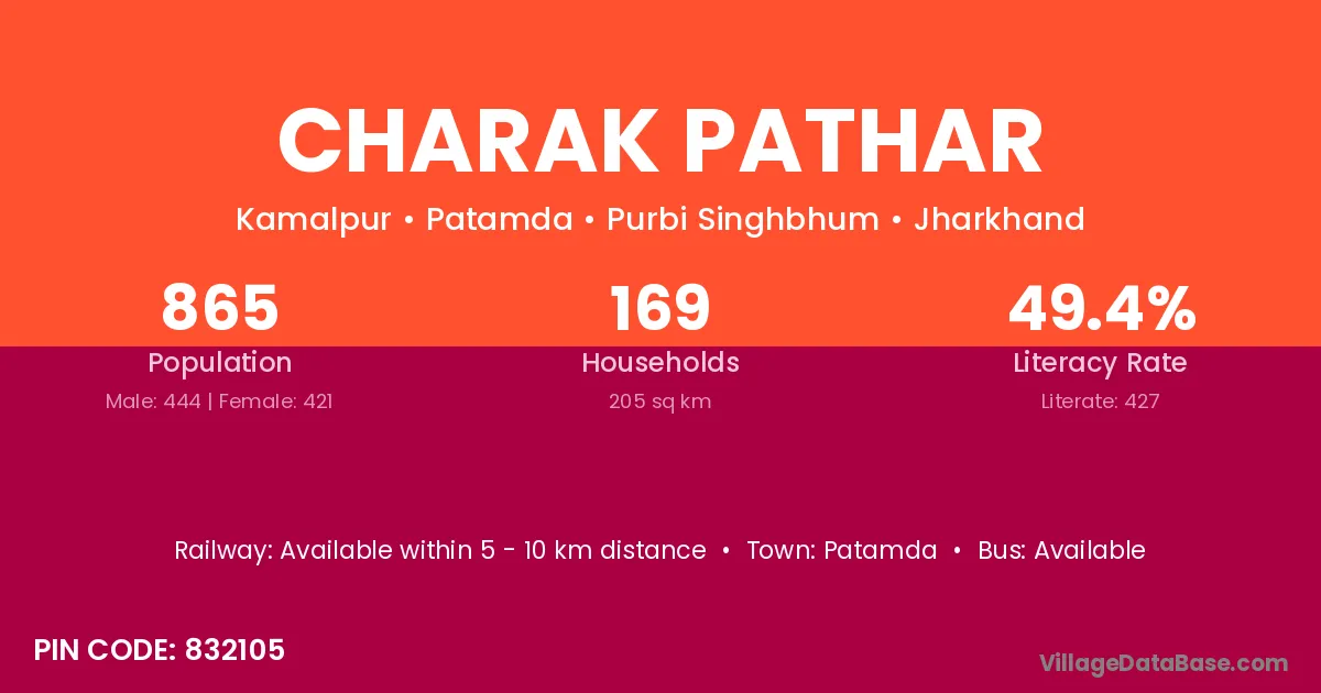 Charak Pathar village has a total population of 865 people, of which 444 are males and 421 are females.