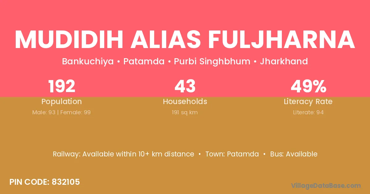 Mudidih Alias Fuljharna village has a total population of 192 people, of which 93 are males and 99 are females.