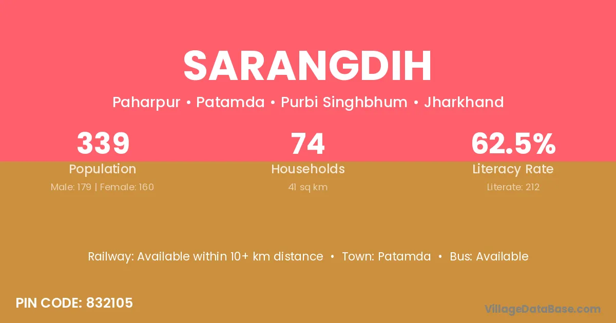 Sarangdih village has a total population of 339 people, of which 179 are males and 160 are females.