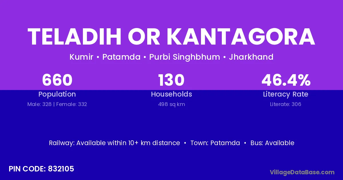 Teladih Or Kantagora village has a total population of 660 people, of which 328 are males and 332 are females.