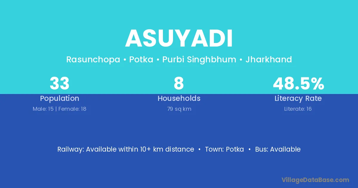 Asuyadi village has a total population of 33 people, of which 15 are males and 18 are females.
