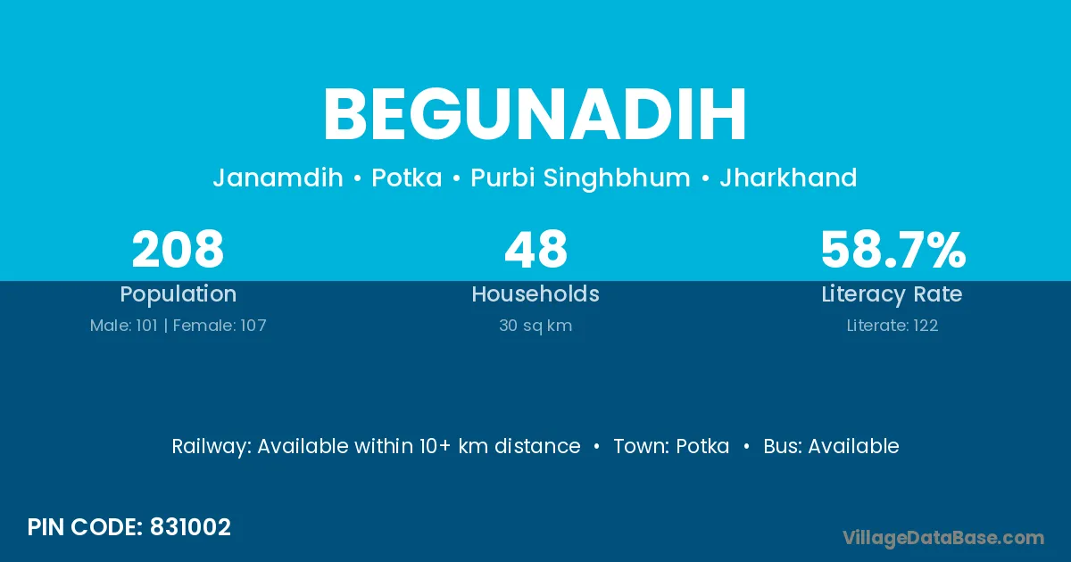 Begunadih village has a total population of 208 people, of which 101 are males and 107 are females.