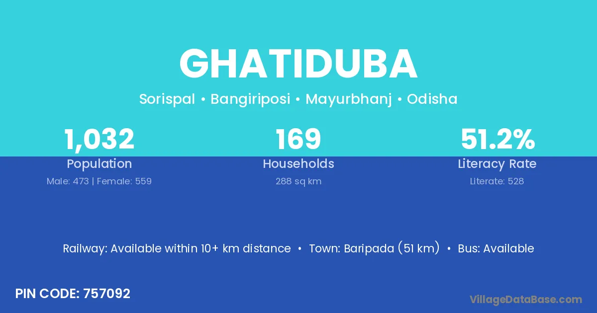 Ghatiduba village has a total population of 221 people, of which 104 are males and 117 are females.