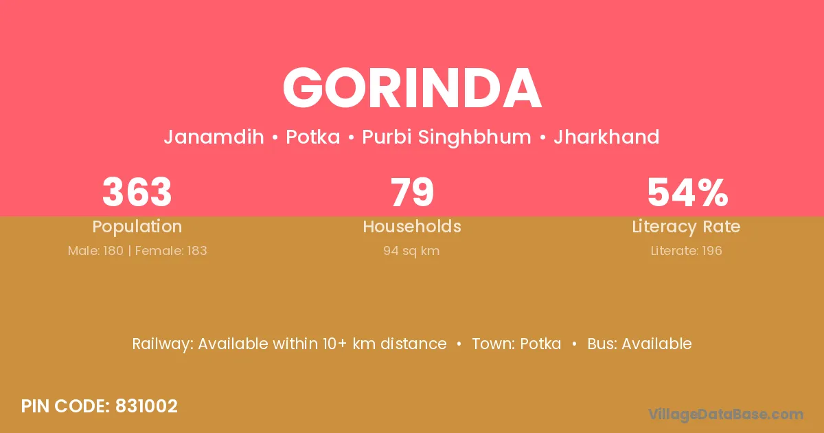 Gorinda village has a total population of 363 people, of which 180 are males and 183 are females.