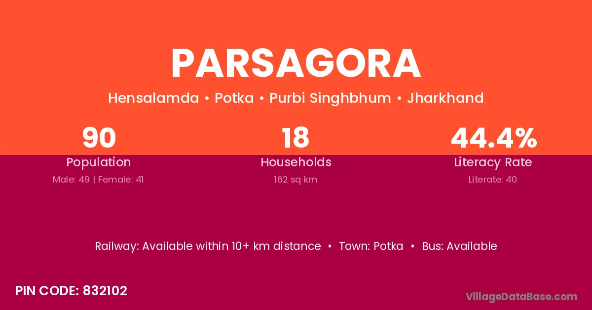 The literacy rate of Parsagora village is 44.44%. Male literacy stands at 55.10% and female literacy at 31.71%.