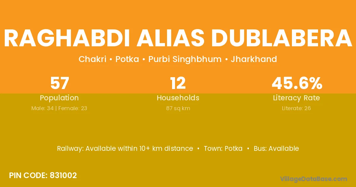 Raghabdi Alias Dublabera village has a total population of 57 people, of which 34 are males and 23 are females.