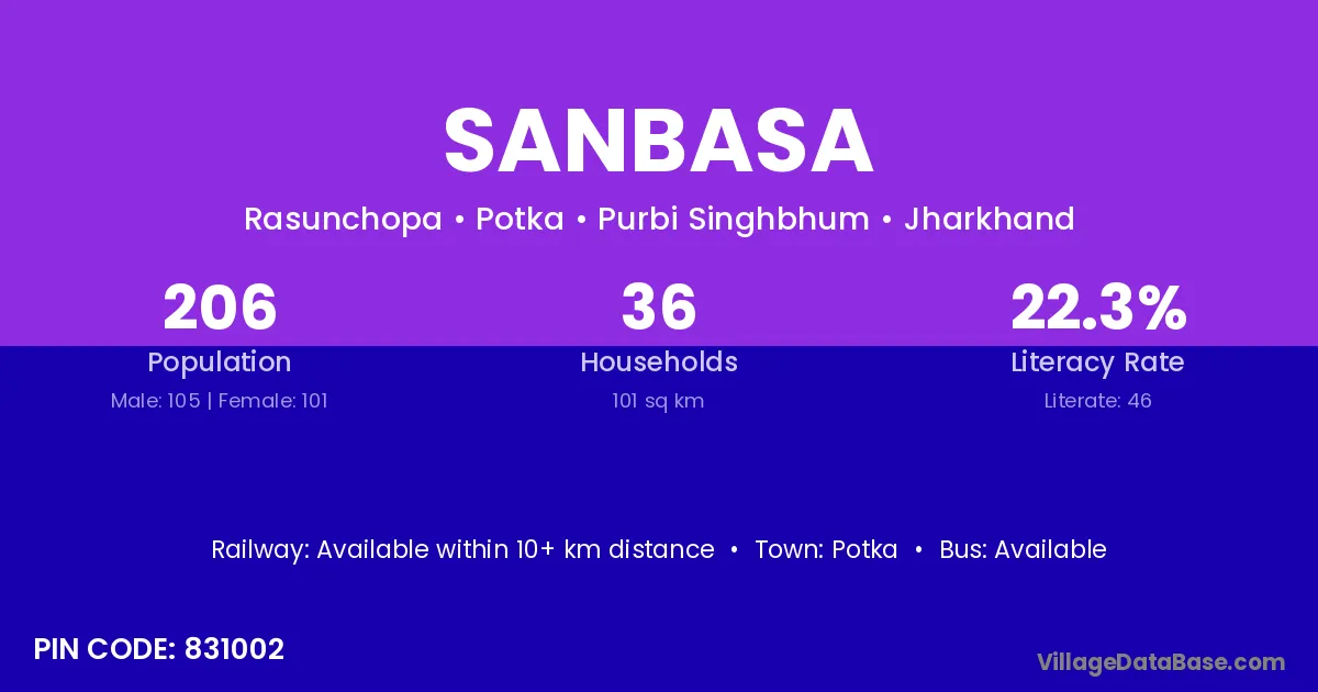 Sanbasa village has a total population of 206 people, of which 105 are males and 101 are females.