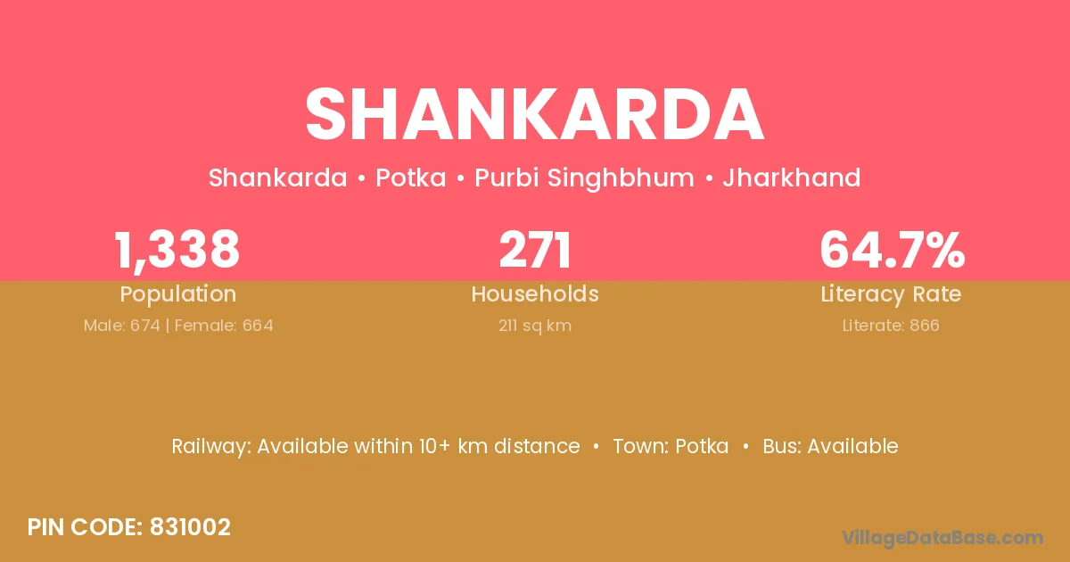 Shankarda village has a total population of 1,338 people, of which 674 are males and 664 are females.