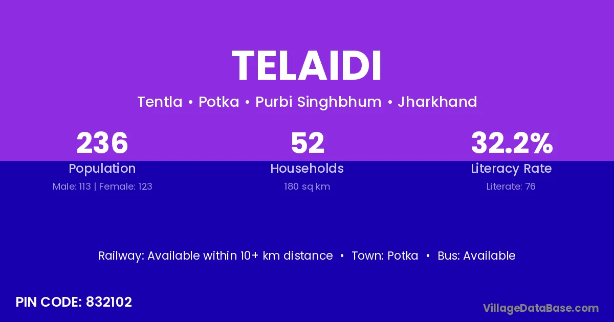 Telaidi village is located in the Potka Subdivision of the Purbi Singhbhum district in Jharkhand .