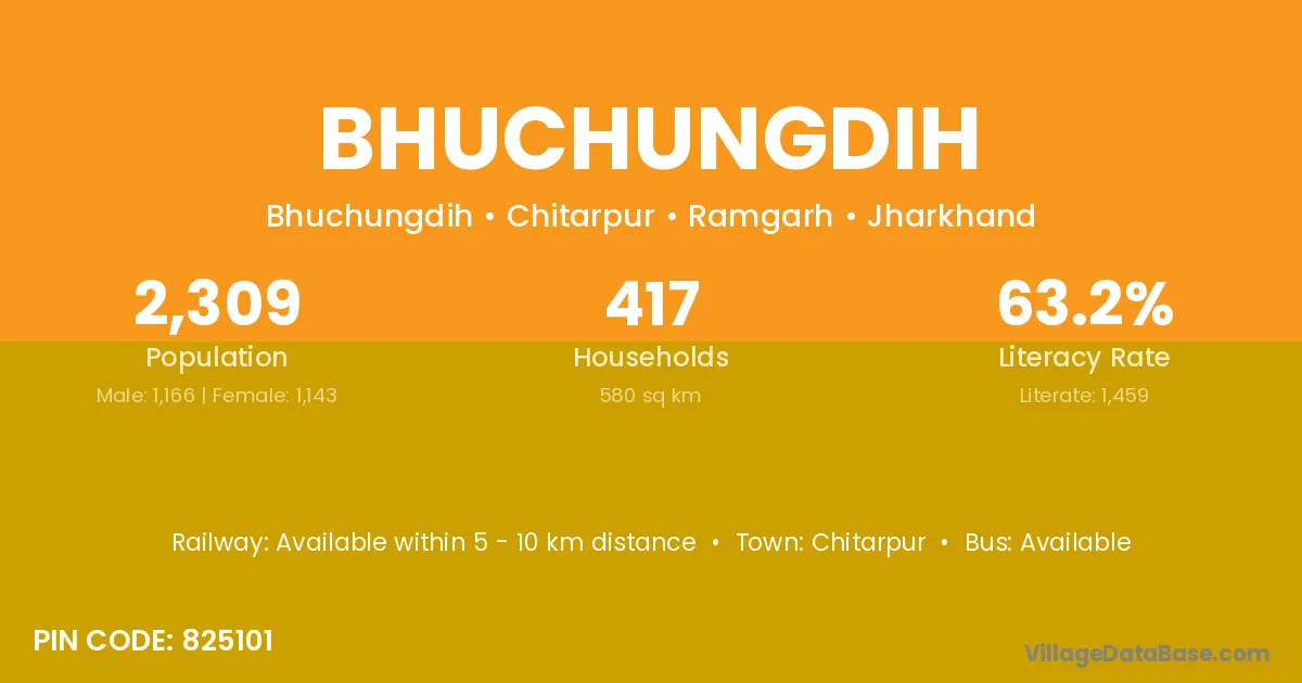 Bhuchungdih village has a total population of 2,309 people, of which 1,166 are males and 1,143 are females.
