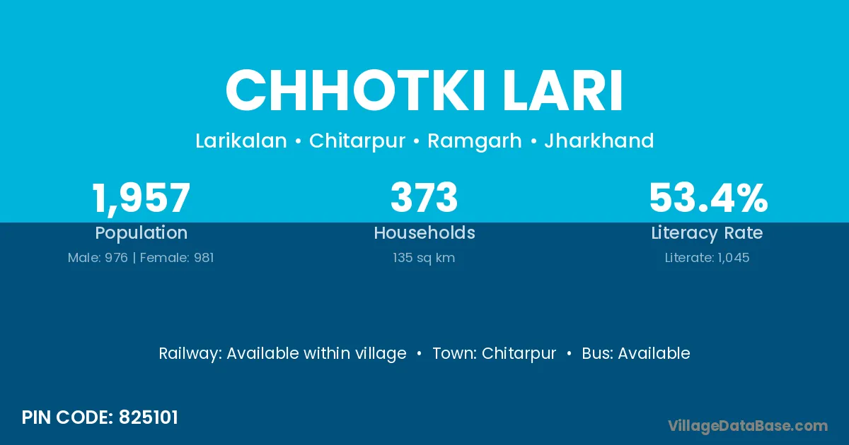 Chhotki Lari village has a total population of 1,957 people, of which 976 are males and 981 are females.