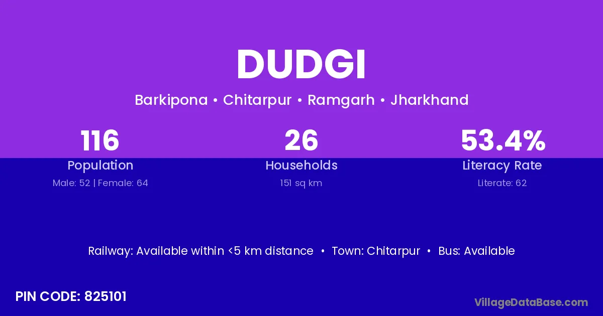 Dudgi village has a total population of 116 people, of which 52 are males and 64 are females.