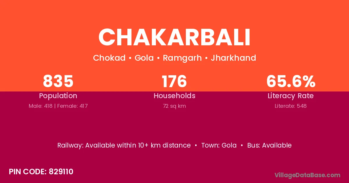 Chakarbali village has a total population of 835 people, of which 418 are males and 417 are females.