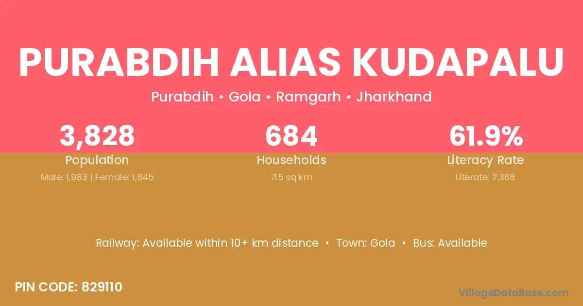 Purabdih Alias Kudapalu village has a total population of 3,828 people, of which 1,983 are males and 1,845 are females.