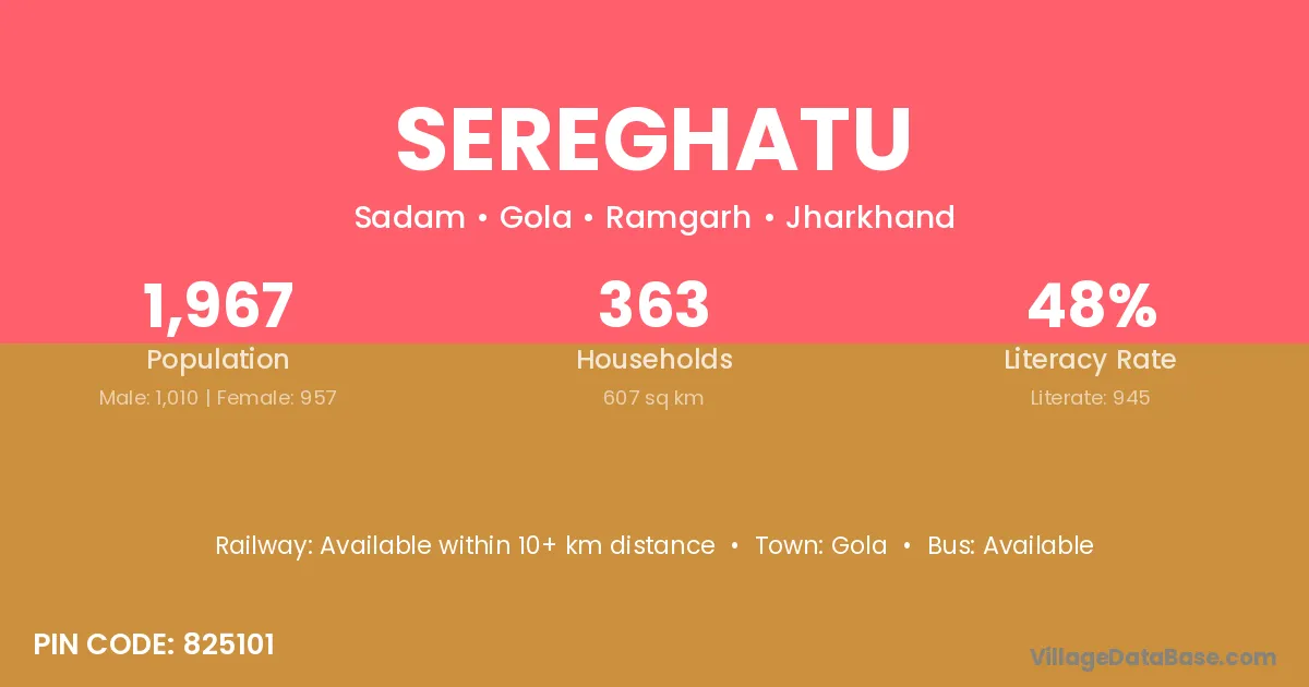 Sereghatu village has a total population of 1,967 people, of which 1,010 are males and 957 are females.