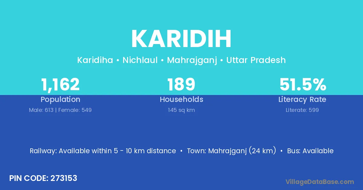 The literacy rate of Karidih village is 39.63%. Male literacy stands at 51.01% and female literacy at 30.08%.