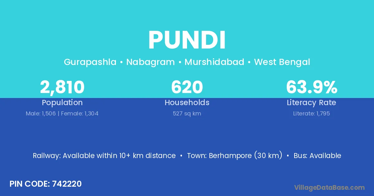 The literacy rate of Pundi village is 54.88%. Male literacy stands at 64.10% and female literacy at 45.51%.