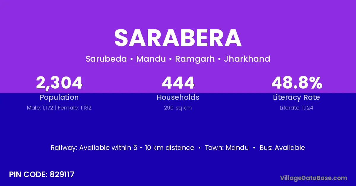 Sarabera village has a total population of 2,304 people, of which 1,172 are males and 1,132 are females.