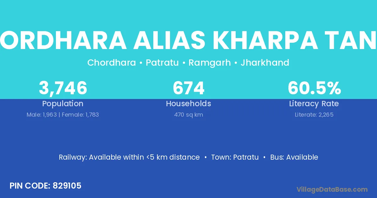 Chordhara Alias Kharpa Tanga village has a total population of 3,746 people, of which 1,963 are males and 1,783 are females.