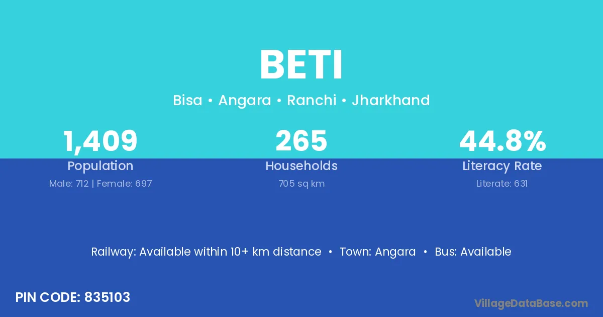 Beti village has a total population of 1,409 people, of which 712 are males and 697 are females.