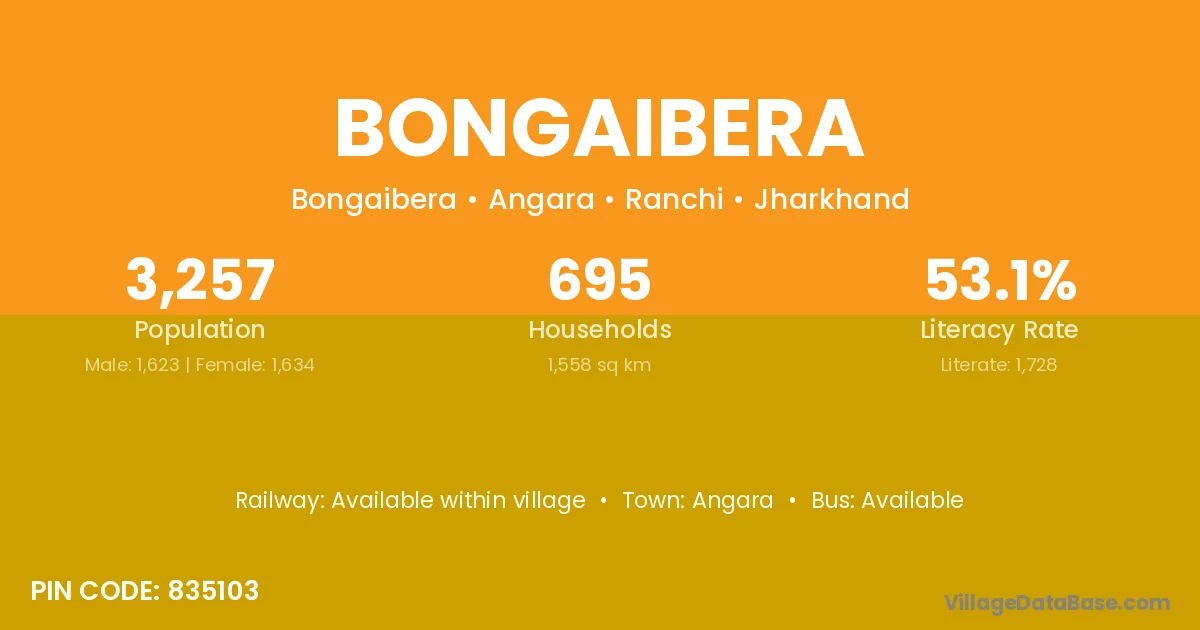 Bongaibera village has a total population of 3,257 people, of which 1,623 are males and 1,634 are females.