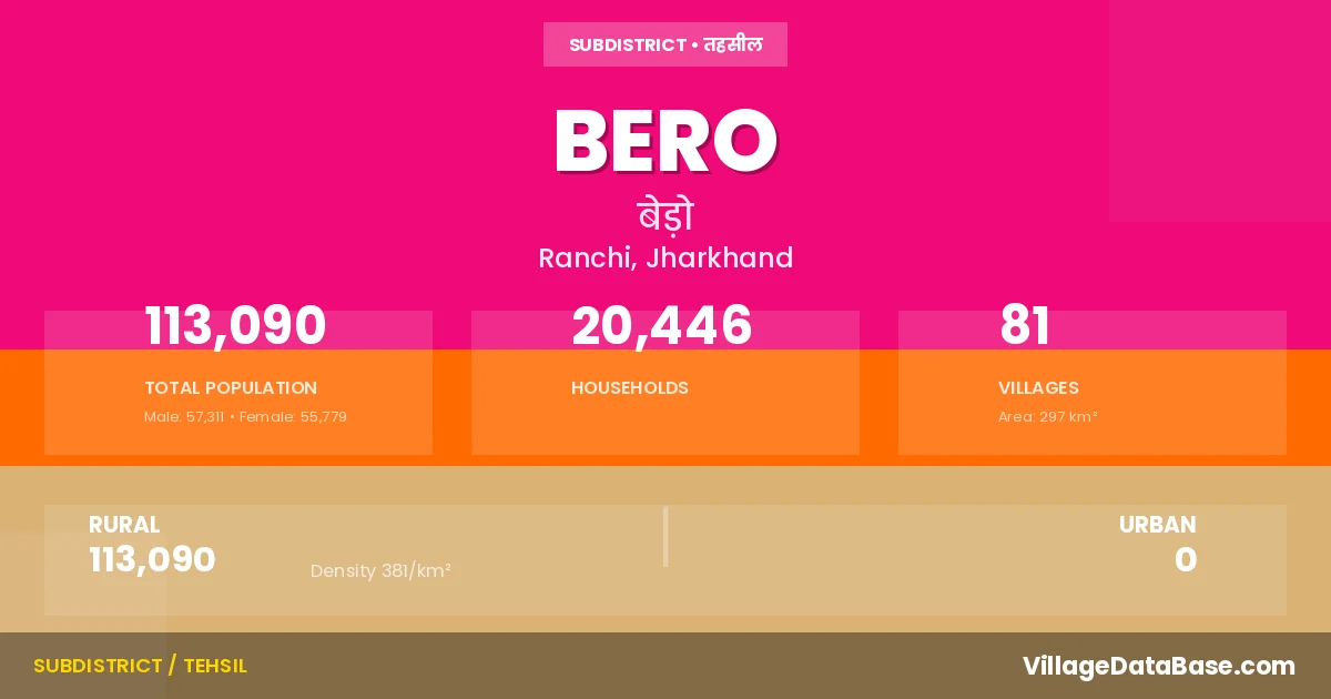Bero is a town and Subdivision in the Ranchi district of the Jharkhand. In India, a Subdivision is a subdivision of a district responsible for the administration and revenue collection of a specific area within the district. Subdivisions play a crucial role in the local governance structure, contributing significantly to the development and administration of their communities.