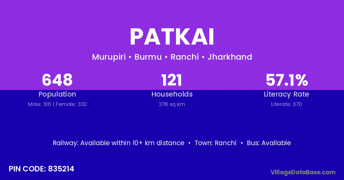 Patkai village has a total population of 648 people, of which 316 are males and 332 are females.