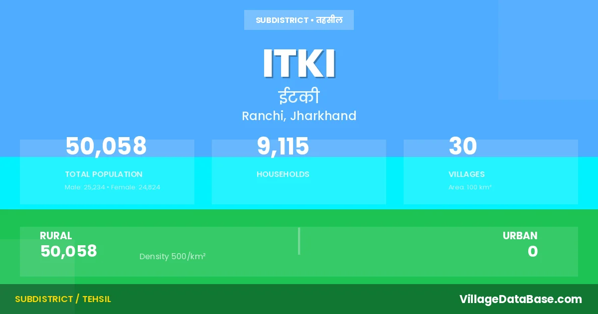 According to the 2011 census The total area of Itki Subdivision is 100 km², with a population of 50058 people. The population density is 500 inhabitants per square kilometre, and there are approximately 9115 houses in the sub district.