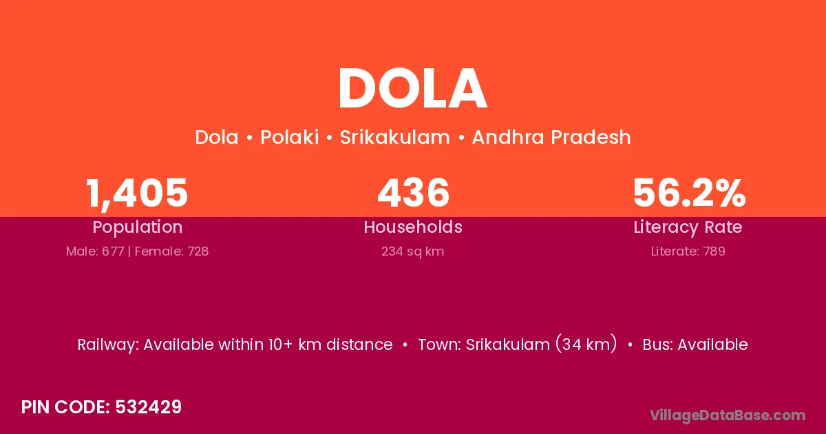 The literacy rate of Dola village is 45.54%. Male literacy stands at 51.60% and female literacy at 39.13%.