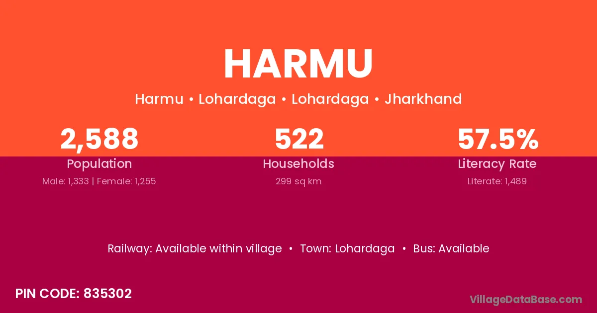 According to Census 2011 information, the village code of Harmu village is 835303.
