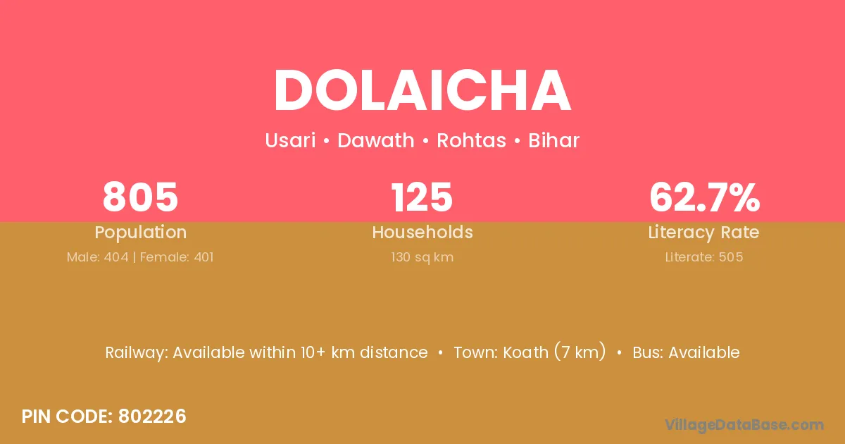 The literacy rate of Dolaicha village is 52.92%. Male literacy stands at 61.87% and female literacy at 43.73%.
