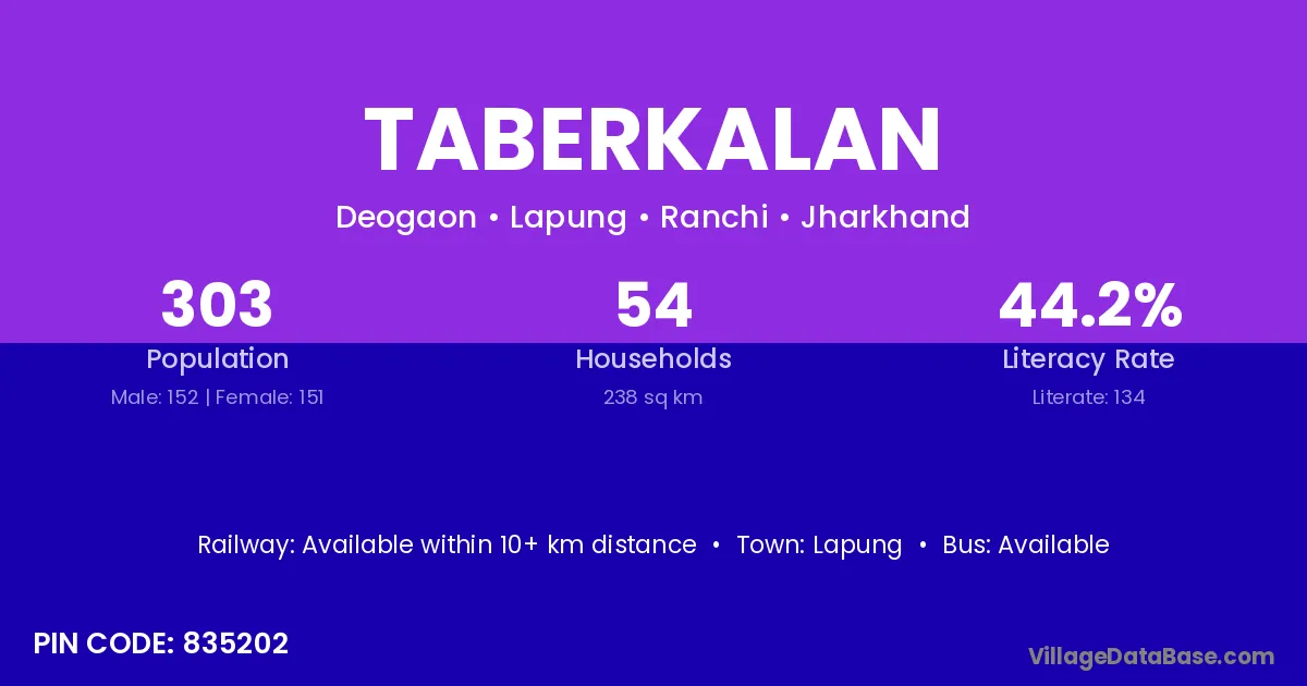 Taberkalan village has a total population of 303 people, of which 152 are males and 151 are females.