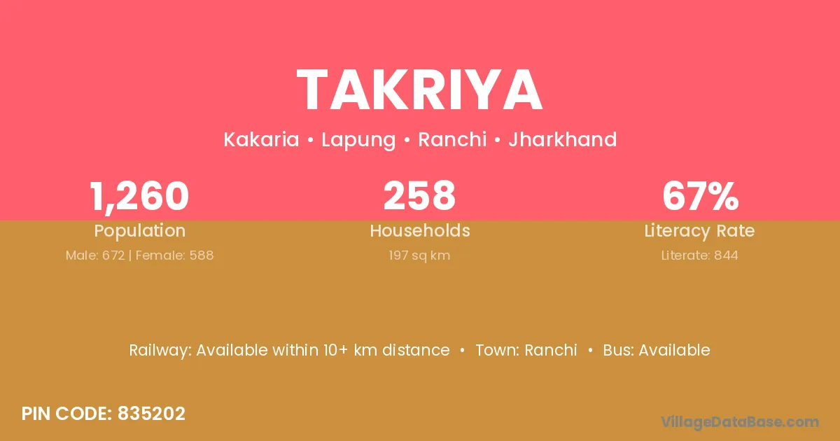Takriya village has a total population of 1,260 people, of which 672 are males and 588 are females.