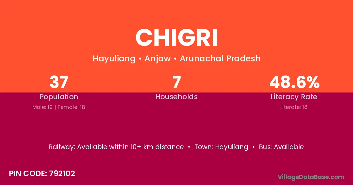 The literacy rate of Chigri village is 67.28%. Male literacy stands at 77.14% and female literacy at 57.96%.