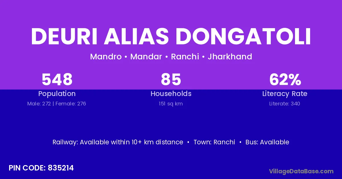 Deuri Alias Dongatoli village has a total population of 548 people, of which 272 are males and 276 are females.