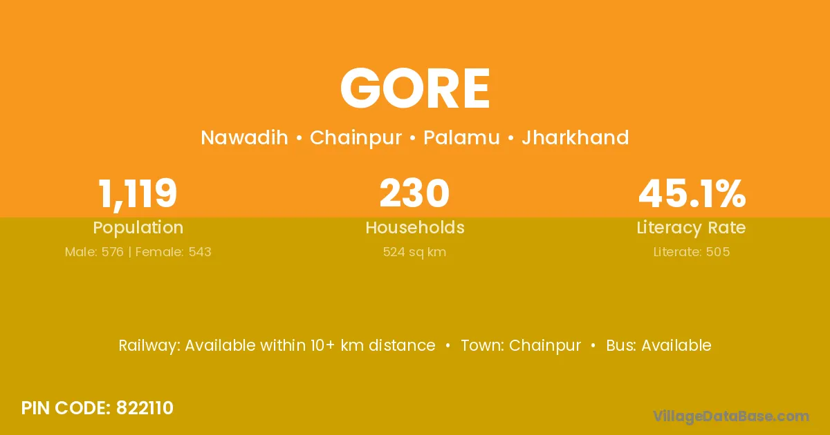 The literacy rate of Gore village is 59.23%. Male literacy stands at 68.90% and female literacy at 49.19%.