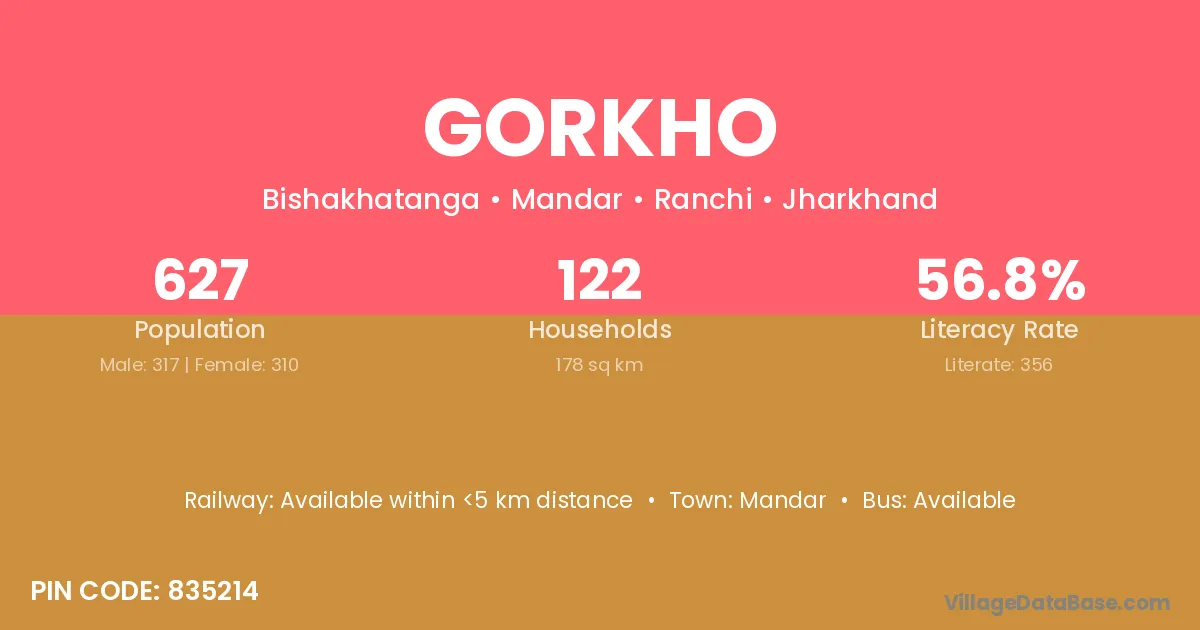 Gorkho village has a total population of 627 people, of which 317 are males and 310 are females.