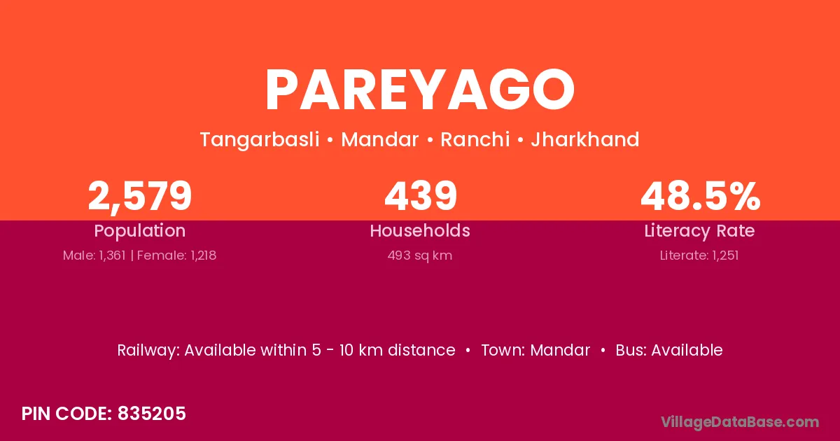 Pareyago village has a total population of 2,579 people, of which 1,361 are males and 1,218 are females.
