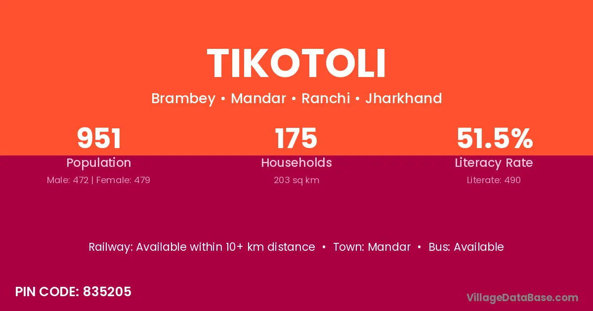 Tikotoli village has a total population of 951 people, of which 472 are males and 479 are females.