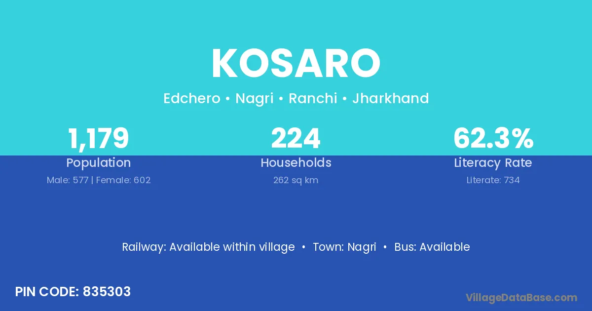 Kosaro village has a total population of 1,179 people, of which 577 are males and 602 are females.