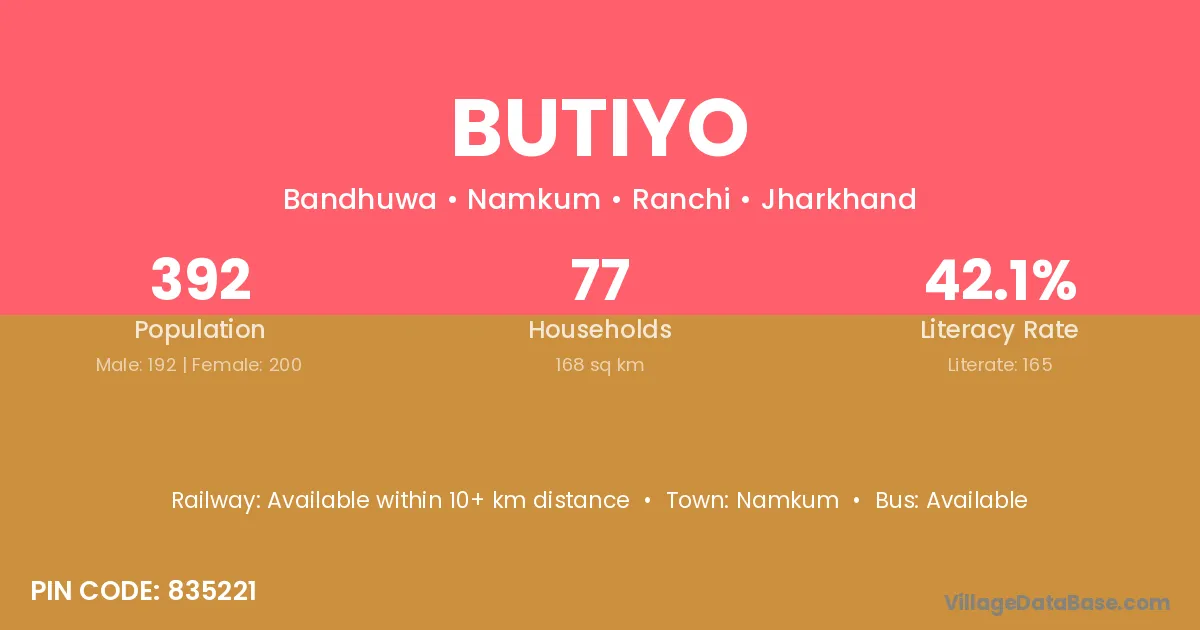Butiyo village has a total population of 392 people, of which 192 are males and 200 are females.