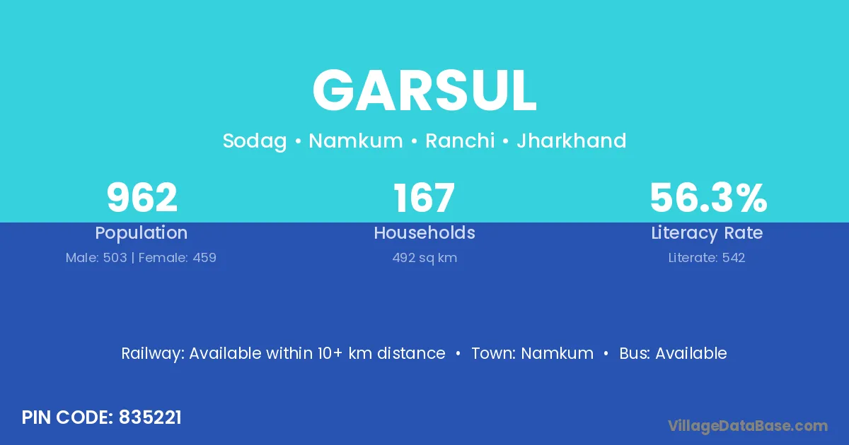 Garsul village has a total population of 962 people, of which 503 are males and 459 are females.
