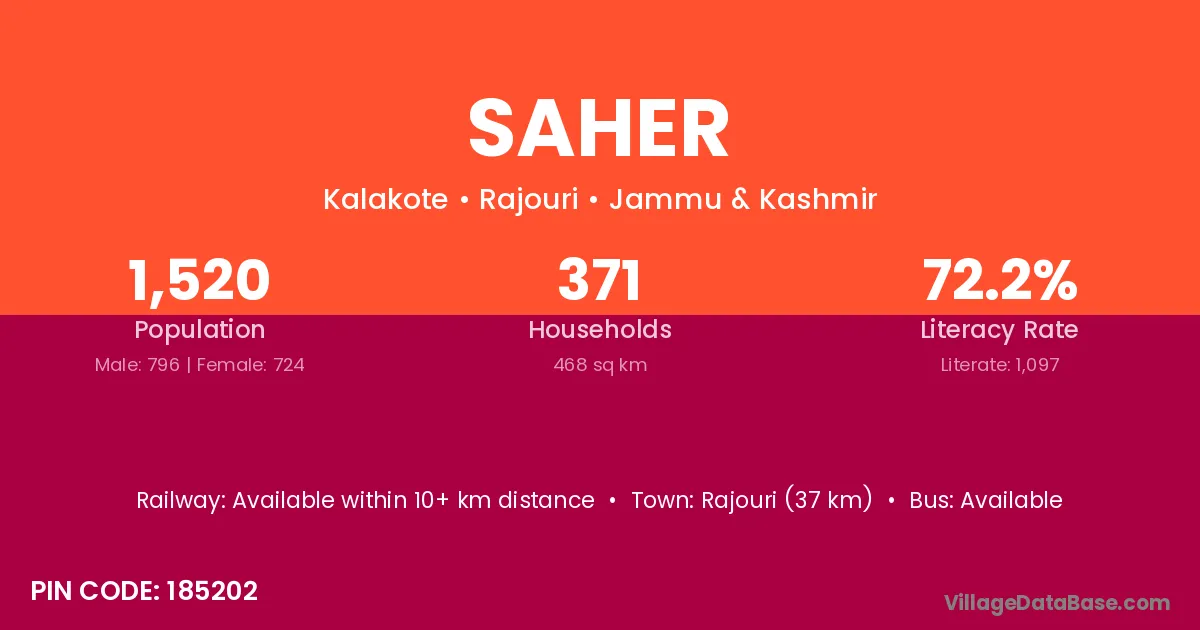 The literacy rate of Saher village is 44.92%. Male literacy stands at 53.75% and female literacy at 38.32%.