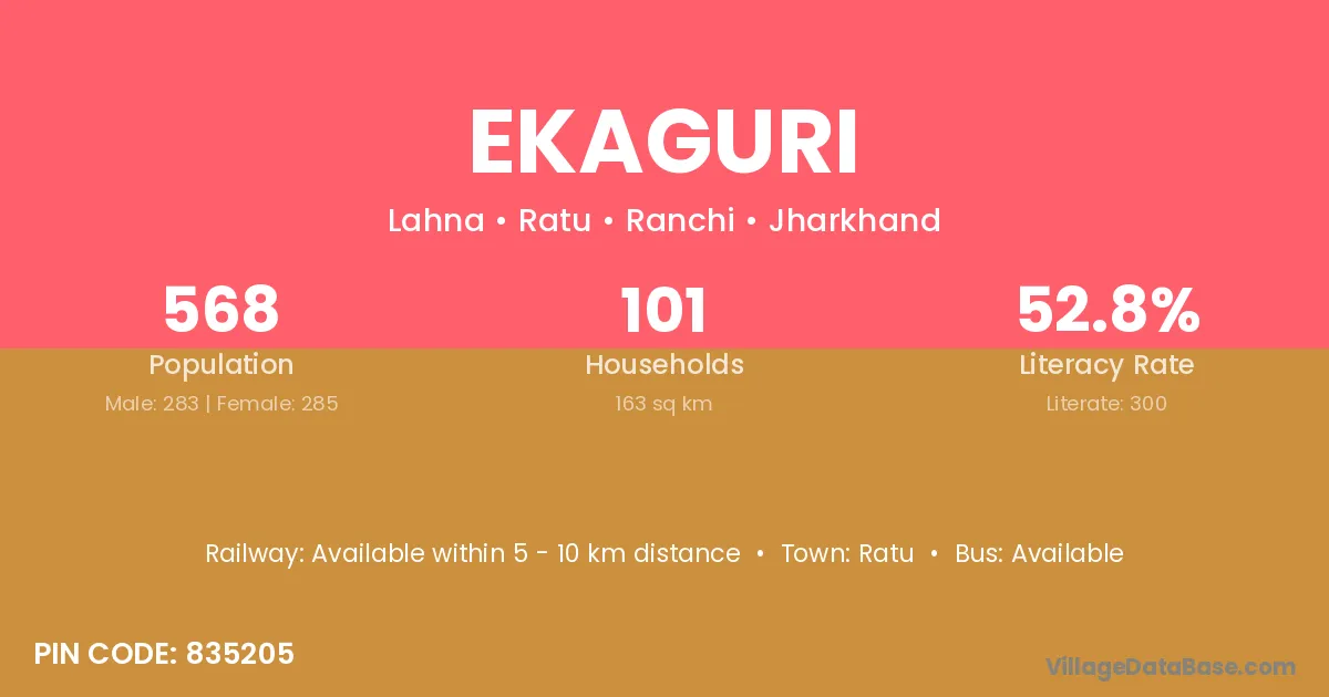 Ekaguri village has a total population of 568 people, of which 283 are males and 285 are females.