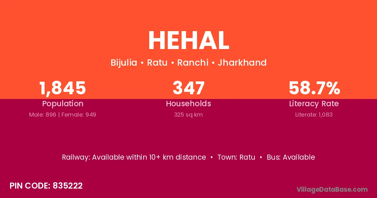 According to Census 2011 information, the village code of Hehal village is 835222.