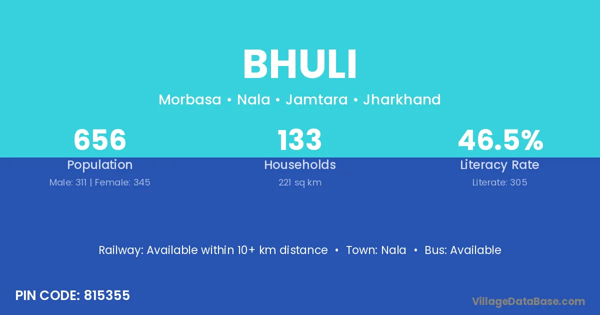 The literacy rate of Bhuli village is 46.87%. Male literacy stands at 57.22% and female literacy at 36.90%.